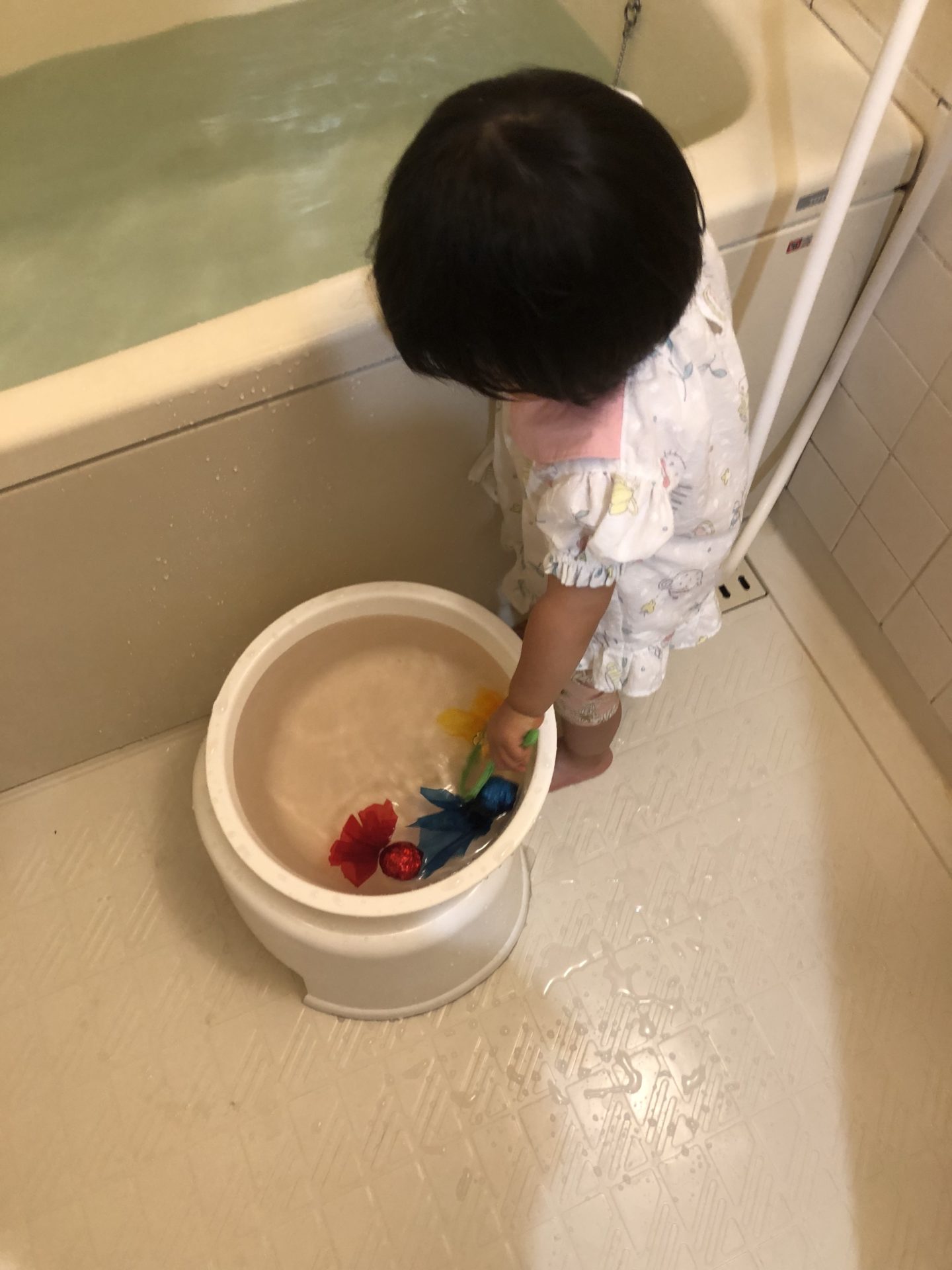 お風呂には入れずに洗面器で遊んでください。